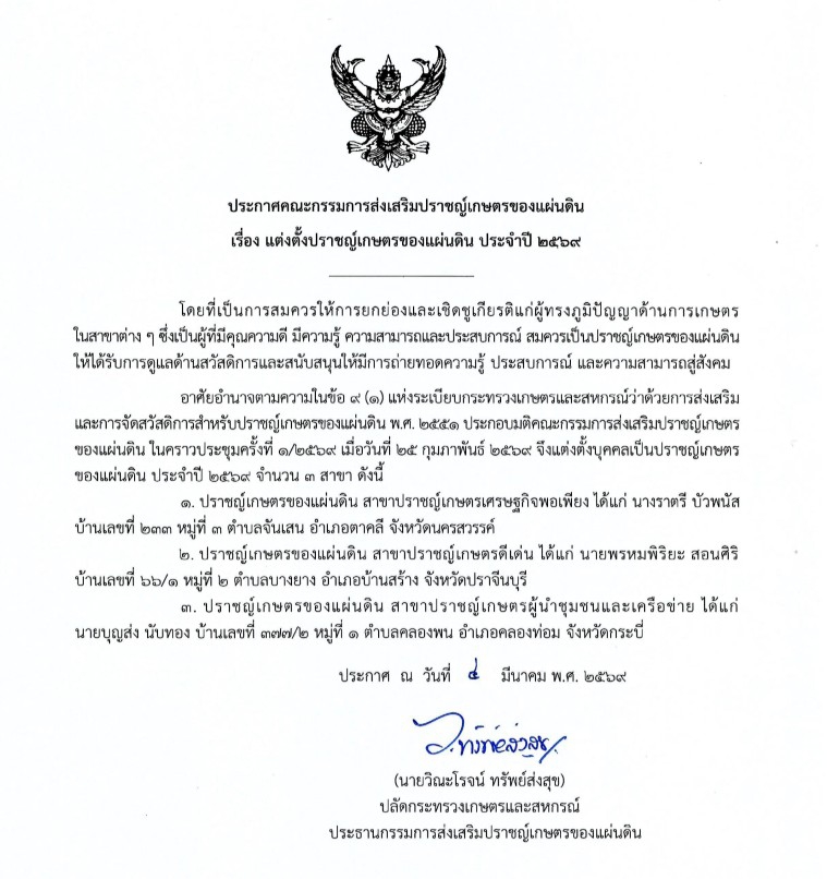 ประชาสัมพันธ์ประกาศแต่งตั้งปราชญ์เกษตรของแผ่นดิน ประจำปี 2569