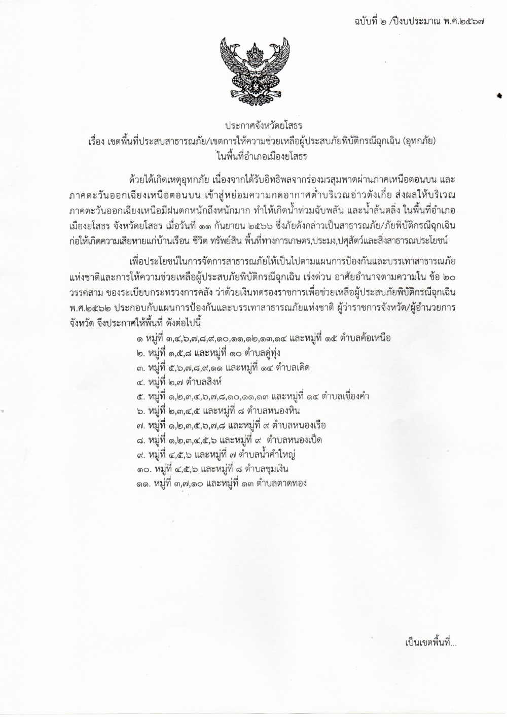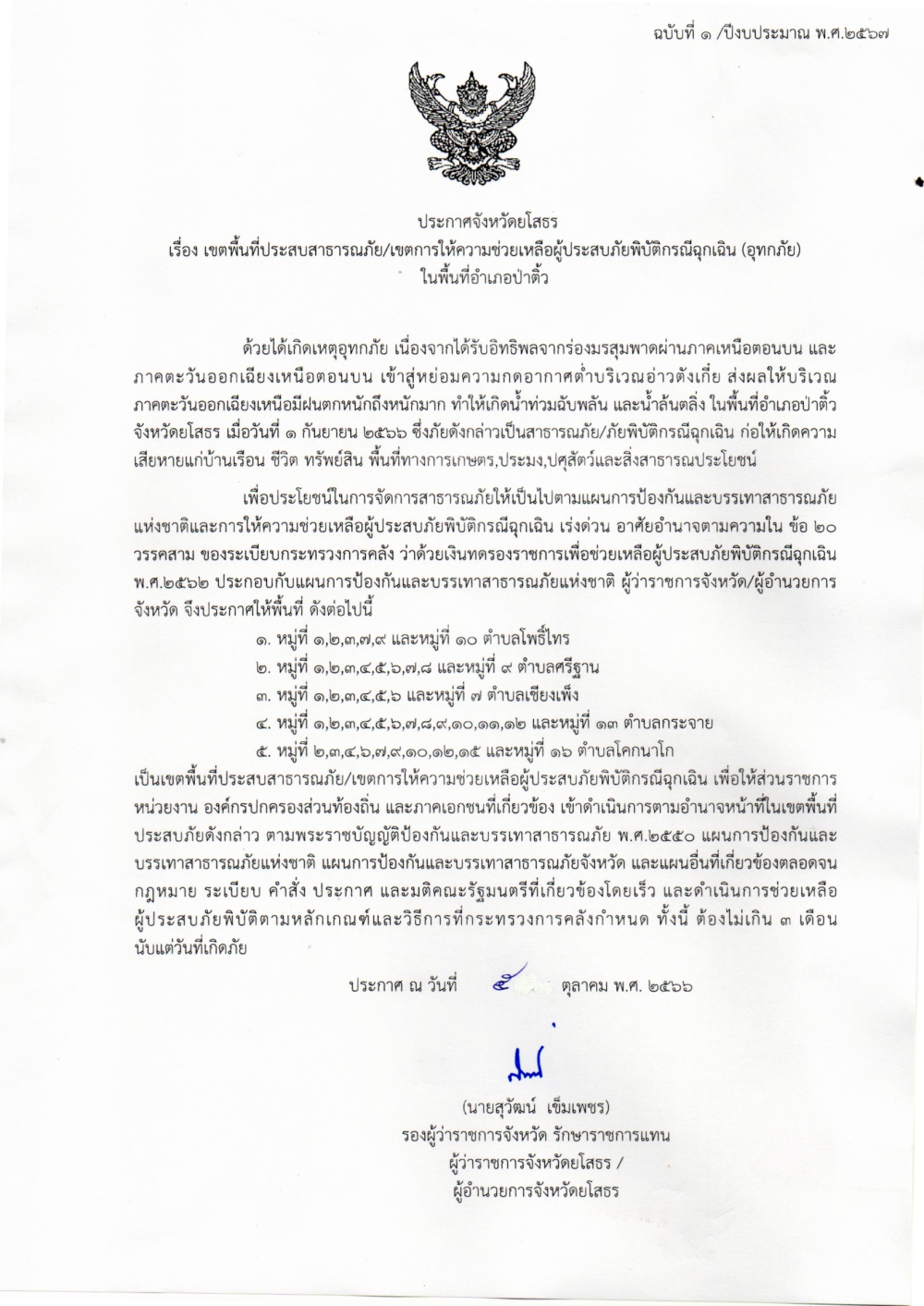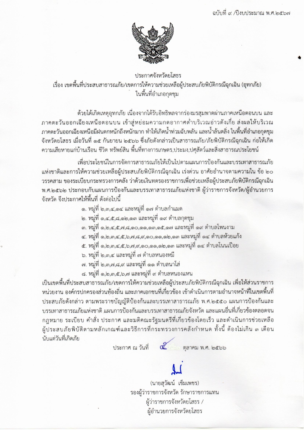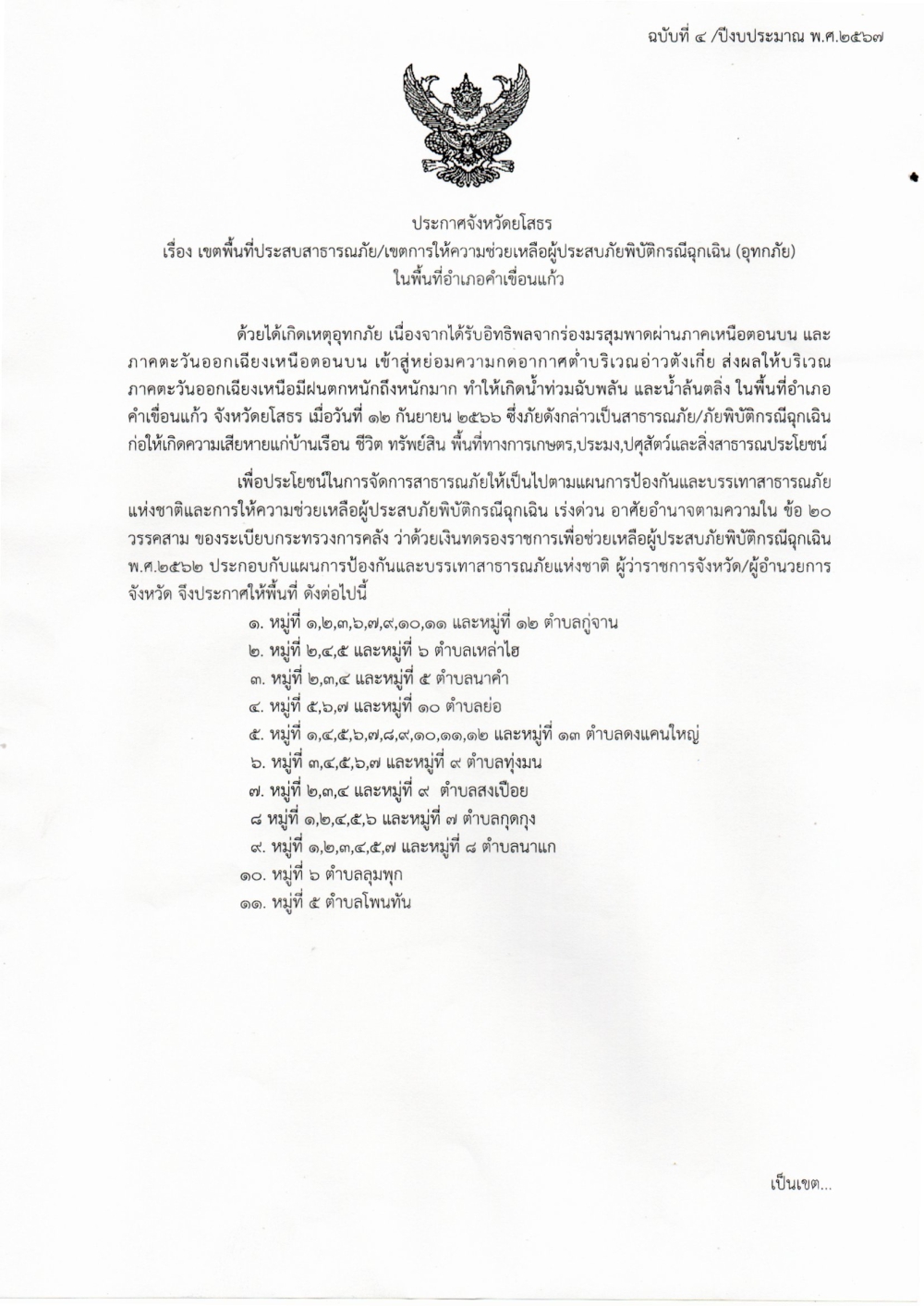 ประกาศจังหวัด เรื่อง เขตพื้นที่ประสบสาธารณะภัย เขตการให้ความช่วยเหลือผู้ประสบภัยพิบัติกรณีฉุกเฉิน (อุทกภัย)