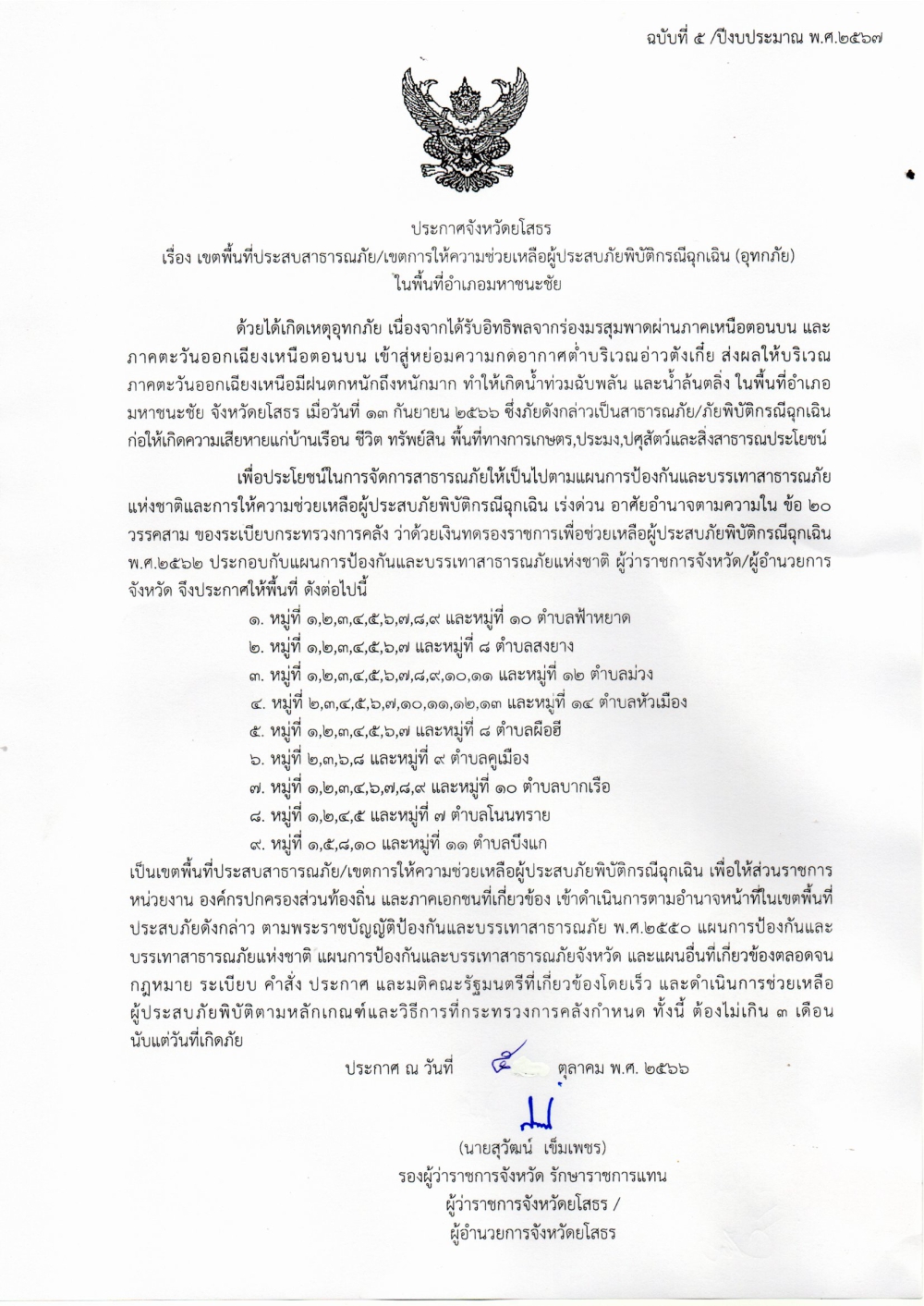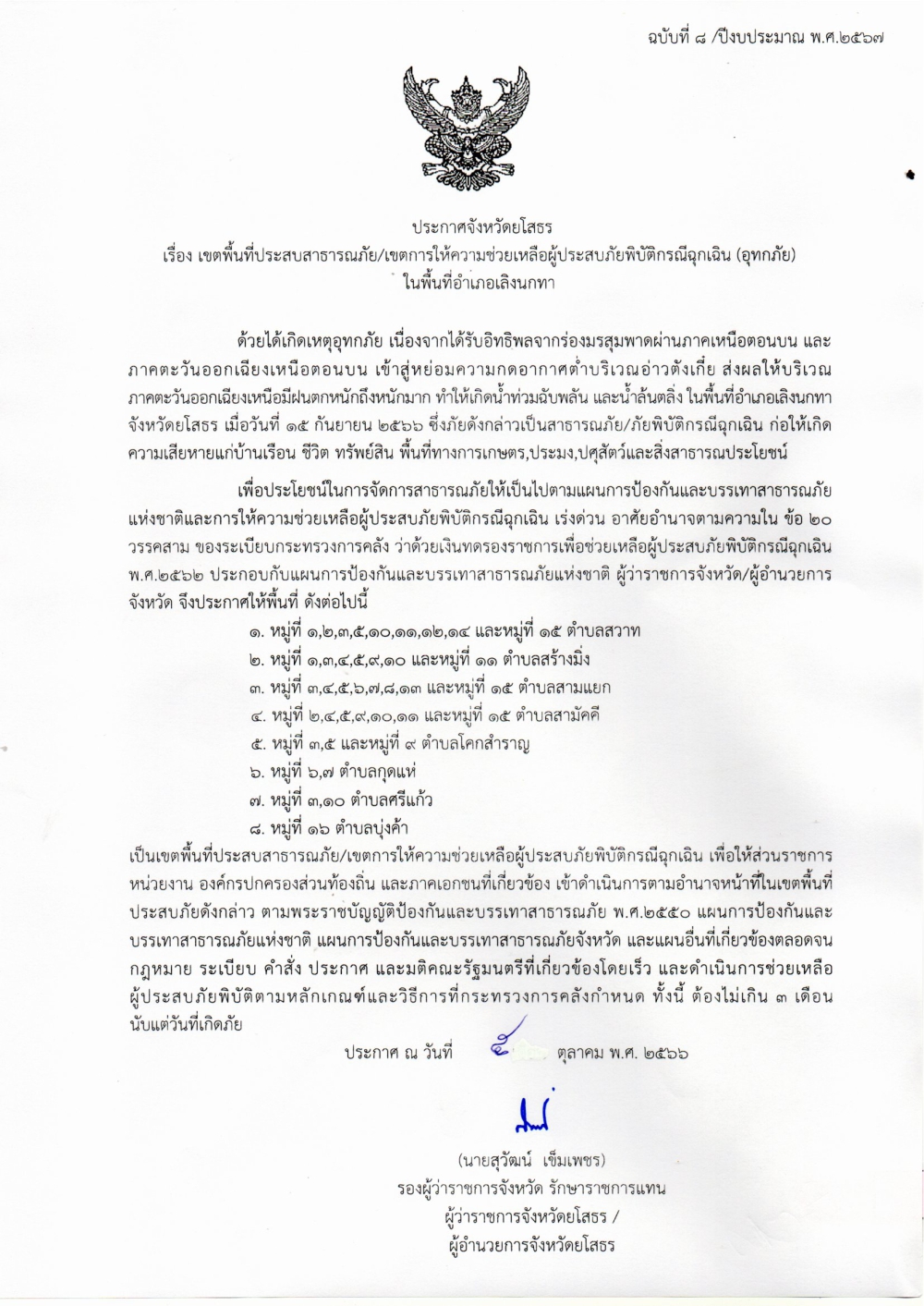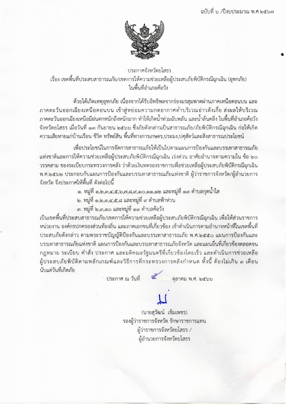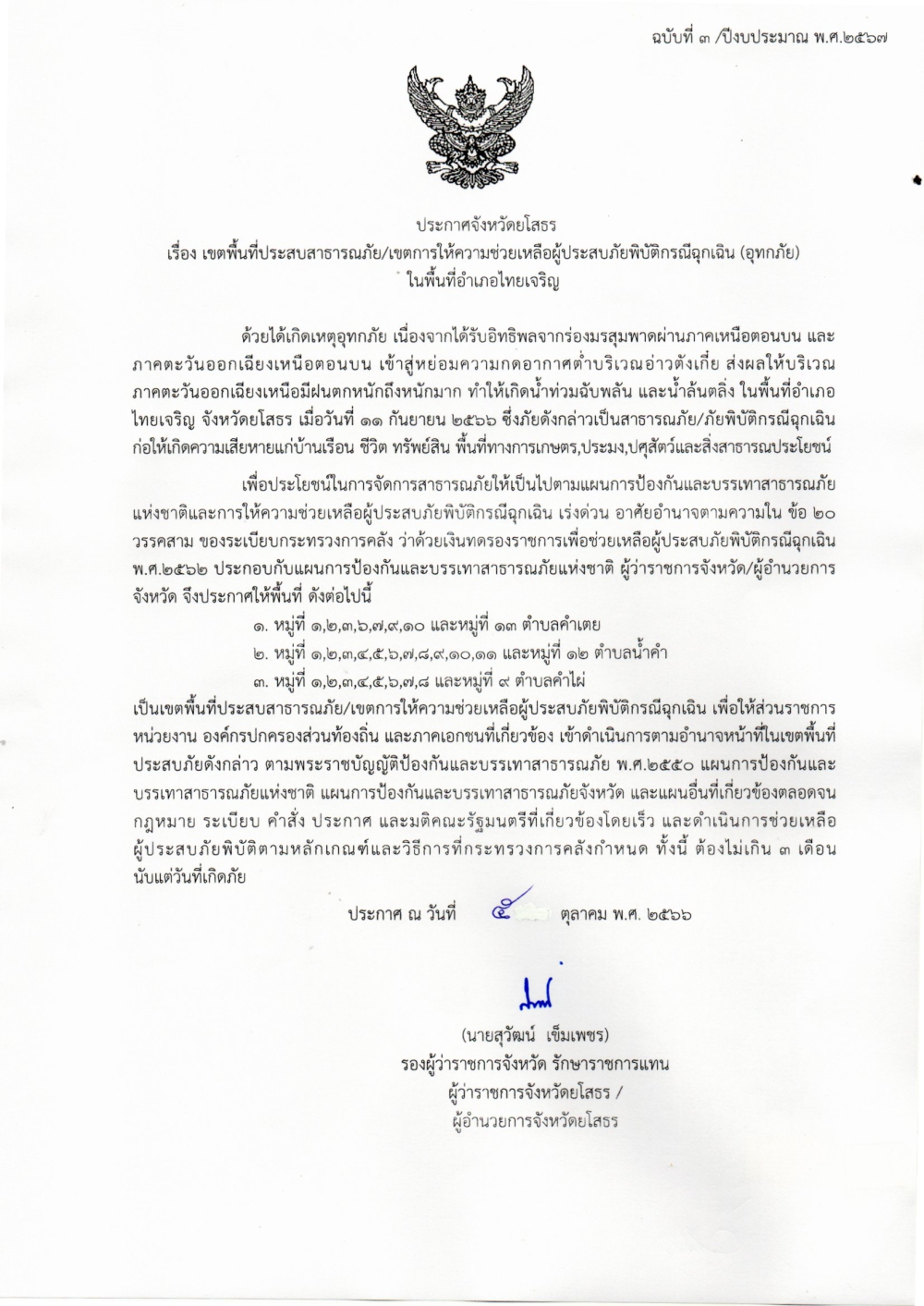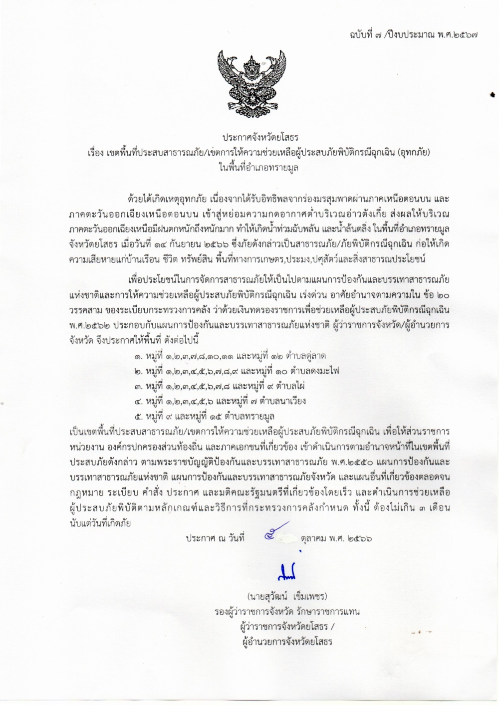 ประกาศจังหวัด เรื่อง เขตพื้นที่ประสบสาธารณะภัย เขตการให้ความช่วยเหลือผู้ประสบภัยพิบัติกรณีฉุกเฉิน (อุทกภัย)